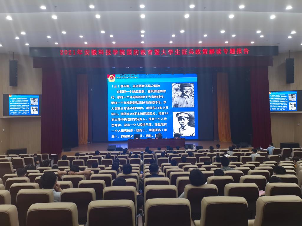 国无防不立,民无兵不安。为进一步加强国防教育,增进广大师生爱国热情,根据本年度国防教育暨征兵工作安排,5月26日下午,学校在龙湖校区东辅楼报告厅举办了2021年国防教育暨大学生征兵政策解读专题报告会。蚌山区人民武装部政委刘跃、部长曾鸣受邀为师生作报告。校人武部负责人、龙湖校区各学院征兵联络人、毕业班学生和全体辅导员以及有意向参军的同学参加了此次报告会。会议由校人武部副部长邵传雷主持。