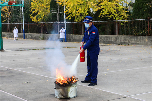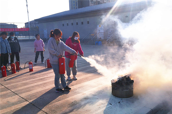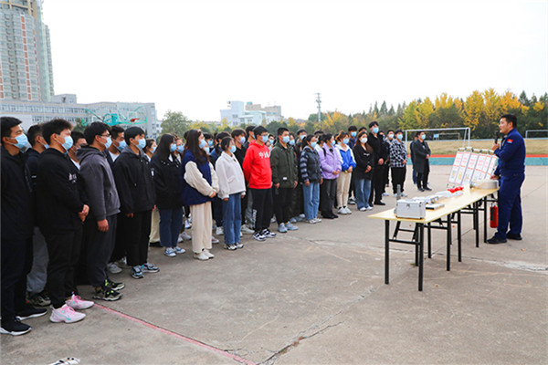 演练分为三个阶段进行,第一阶段由消防救援大队消防培训专家根据高校火灾发生特点,讲解消防安全的基本常识、初起火灾时扑救方法、逃生知识和使用灭火器的方法;第二阶段由消防救援大队消防培训专家详细讲解校园中常见的消防器材及消防救援大队常用的消防设备的功能及使用方法;第三阶段由参演学生分批、分组进行现场灭火实操演练。