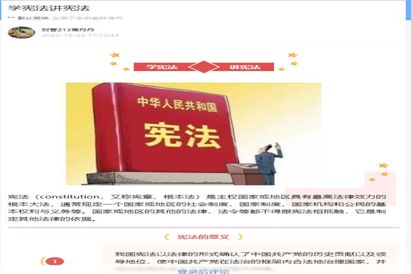 为进一步贯彻落实习近平总书记关于宪法学习宣传教育的系列重要指示精神,推动广大同学集中深入学习宣传宪法,弘扬宪法精神,维护宪法权威,10月25日至11月1日,财经学院通过线上线下相结合方式开展“学宪法,讲宪法”专题学习活动。