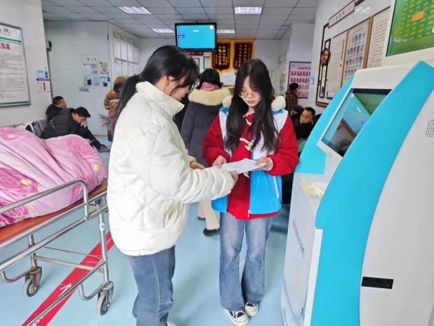 团支部成员席靖靖利用假期参加了“暖冬导医行”的社会实践活动,她认真熟悉了门诊服务的流程以及医院的环境,致力于为每一位就诊病人及家属提供详细的咨询服务,帮助他们快速缴费,使用机器设备等日常就诊事宜。她主动地询问,认真地倾听,为患者提供了各种就医流程引导和服务。获得了很多信任与感谢