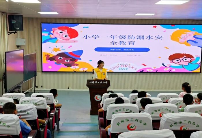 2025年6月28日,在财经学院团委和财务管理专业学生党支部的组织和指导下,财务管理专业“向阳花青春服务队”暑期社会实践团队走进蚌埠市长淮卫镇工农中心小学,开展暑期“三下乡”社会实践活动,为一年级学生带来一堂生动实用的防溺水和心理安全教育课。