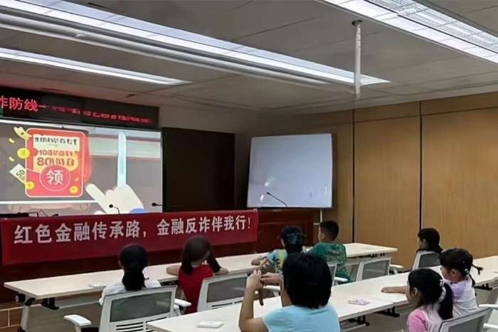 面向小朋友的反诈小课堂上,同学们以童趣的语言、生动的案例教孩子们识别诈骗,让反诈种子在孩子们心中扎根,还鼓励他们当“反诈小卫士”,回家向长辈分享反诈知识,搭建家庭反诈传播纽带。