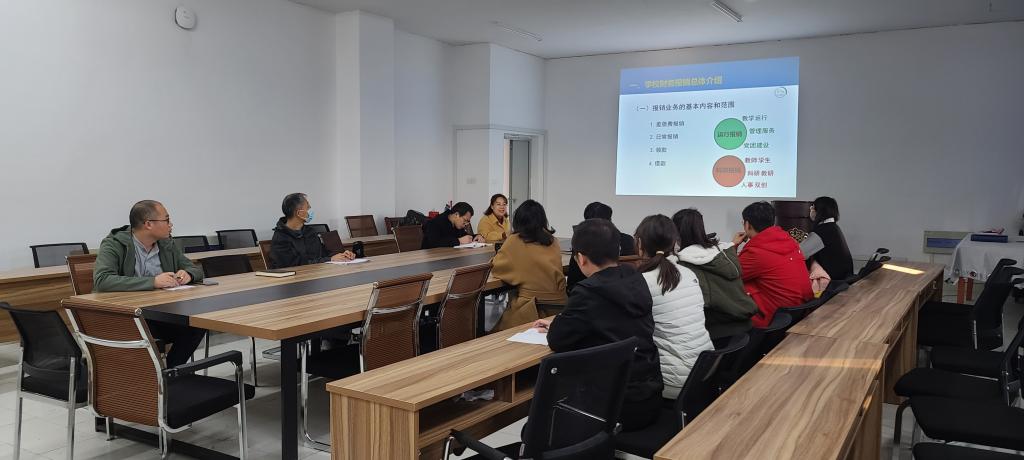 2021年11月19日下午财务处在龙湖校区龙湖校区化学与材料工程学院会议室(敏行楼A 513)举办财务报销培训和深入基层开展财务服务。龙湖校区管理学院、化材学院等学院部分教师和财务处有关人员参加培训会。深入基层服务由卡务中心主任朱迎利开展,培训会由财务处汤文成主讲。