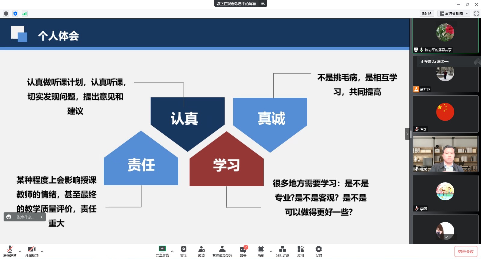 根据会议安排,校教学督导员李影老师、陈忠平老师,财经学院督导组长李强老师,分别分享了学习培训成果,工作体会和创新做法,并提出了工作建议。自由研讨环节,与会人员围绕精准督导、有效督导和创新督导,各抒己见,汇集了智慧,拓展了思路。(特约通讯员:马万征 摄影:卫兰兰 编辑:马万征 审核:程斌)