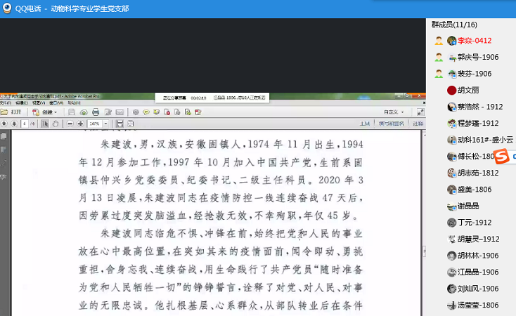 4月22日下午,动物科学专业学生党支部通过QQ群课堂进行政治理论学习,支部全体党员参加会议。会议由党支部书记李焱主持。