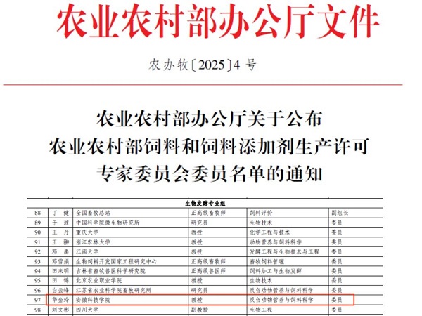 近日,农业农村部办公厅发布农业农村部办公厅关于公布农业农村部饲料和饲料添加剂生产许可专家委员会委员名单,我校动物科学学院副院长华金玲教授入选委员。