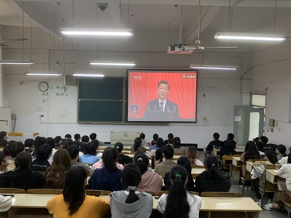 在学知楼A101、102、103教室,学院学生代表集体观看了开幕会直播。跟随习近平总书记的讲话,同学们认真观看,深切感悟。通过观看开幕会,同学们了解了过去五年我国在经济、政治、社会、文化、生态环境等各个方面的发展状况,以及未来祖国的发展蓝图,接受了一次精神上的洗礼。