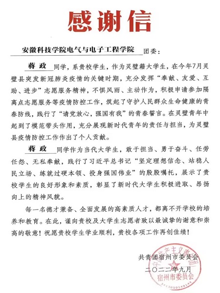 10月12日上午,共青团开云官方注册电气与电子工程学院委员会收到一封来自共青团宿州市委员会的感谢信。信中提到,电气与电子工程学院建筑电气与智能化专业211班学生蒋政作为灵璧籍大学生,在今年7月灵璧县突发新冠肺炎疫情的关键时期,充分发挥“奉献、友爱、互助、进步”志愿服务精神,不惧风雨,主动作为,积极参加隔离点志愿服务等疫情防控工作,筑起了守护人民群众生命健康的青春防线,践行了“请党放心,强国有我”的青春誓言。
