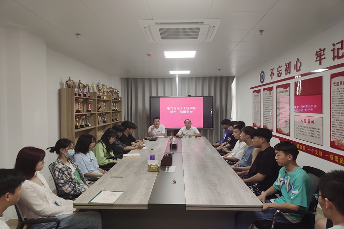 5月18日晚,电气与电子工程学院于西辅楼308召开学生干部大会。学院党委副书记、纪委书记尚磊,团委副书记、学生会指导老师于宏亮出席会议,学生代表参加会议,会议由于宏亮主持。
