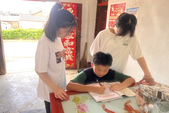 为了解当代农村发展现状,深入贯彻党的二十大精神,切实在社会实践中受教育、做贡献、长才干,7月20日,电气与电子工程学院“好青年”实践团队在指导老师张深的带领下来到安徽省合肥市肥东县桥头集镇马龙山大褚村,通过走访当地居民,为当地留守儿童提供课业辅导、兴趣拓展等服务。