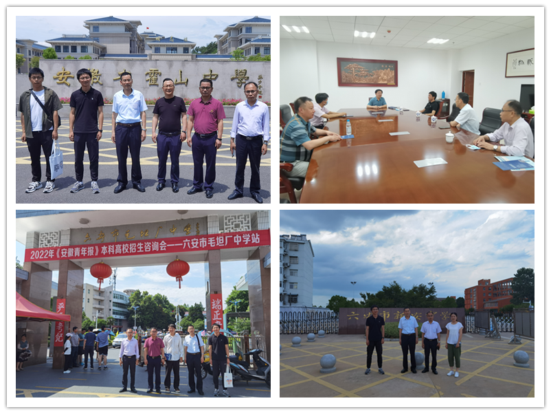 招生宣传工作组先后到访舒城县千人桥中学、舒城县桃溪中学、舒城中学、舒城第一中学、六安市毛坦厂中学、金安高级中学、霍山中学、金寨第一中学、六安实验中学、六安市新安中学、六安一中东校区、六安市城南中学等多所中学,与各高中学校校领导、教导处主任、年级组组长、高三班班主任等进行座谈,并与学生及家长进行沟通交流。