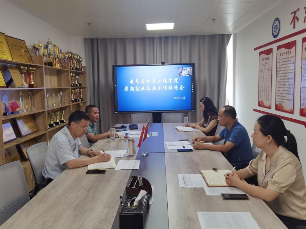 为进一步做好2023届毕业生就业服务工作,确保全体离校毕业生学有所用,稳步推进2023届毕业生相关工作,电气与电子工程学院近日在西附楼308会议室召开2023届毕业生暑期就业征兵工作推进会。学院党委书记骆海邦,党委副书记、院长夏显明,党委副书记、纪委书记尚磊,各毕业班辅导员、就业联系人参加会议。