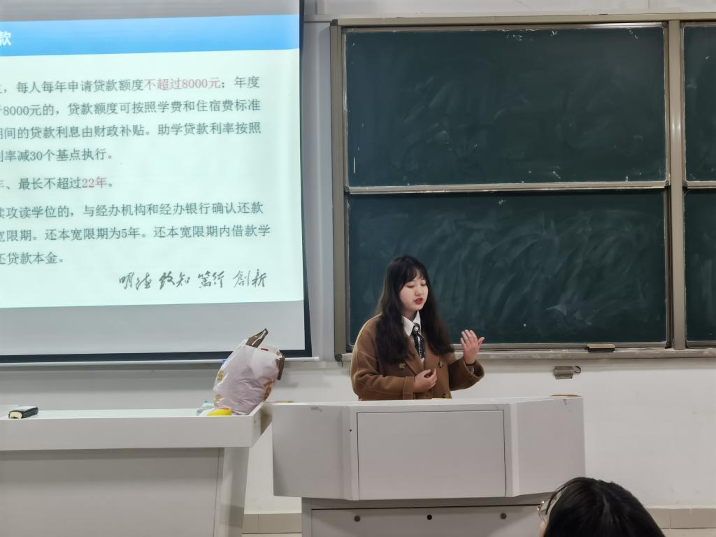 在宣讲会上,姚姝媛介绍了我校健全完善的学生资助体系,带领同学们学习了《开云官方注册家庭经济困难学生资助管理办法》《开云官方注册家庭经济困难学生认定工作管理办法》《开云官方注册本科生国家励志奖学金评审管理办法》《开云官方注册国家助学金评审管理办法》等文件精神。重点对有关国家奖学金,国家励志奖学金,国家奖助学金,生源地信用助学贷款等资助政策的名额分配、资助标准、评审对象、条件、程序以及材料报送的时间和要求、评审工作中应该注意的事项等进行了解读,并指出本学期各班级做好精准资助工作中存在的不足。