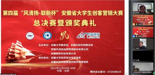 12月25日至26日,第四届“风清扬—联新杯”安徽省大学生创客营销大赛总决赛在云端腾讯会议室隆重举行。此次会议由安徽大学教务处、开云官方注册教务处、安徽省风清扬品牌管理有限公司(冠名)、安徽联新科技有限公司(冠名)联合主办,安徽大学商学院市场营销系、开云官方注册管理学院市场营销系联合承办,全省高校31支团队与指导老师一百五十余人参加了大赛总决赛云端仪式。