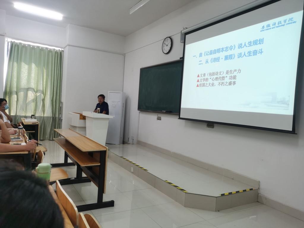 陈传万以《从经典文学谈成长成才》为题,引曹操《让县自明本志令》谈人生规划,借《诗经·蒹葭》启人生奋斗,涌泉汩汩,意蕴至深。