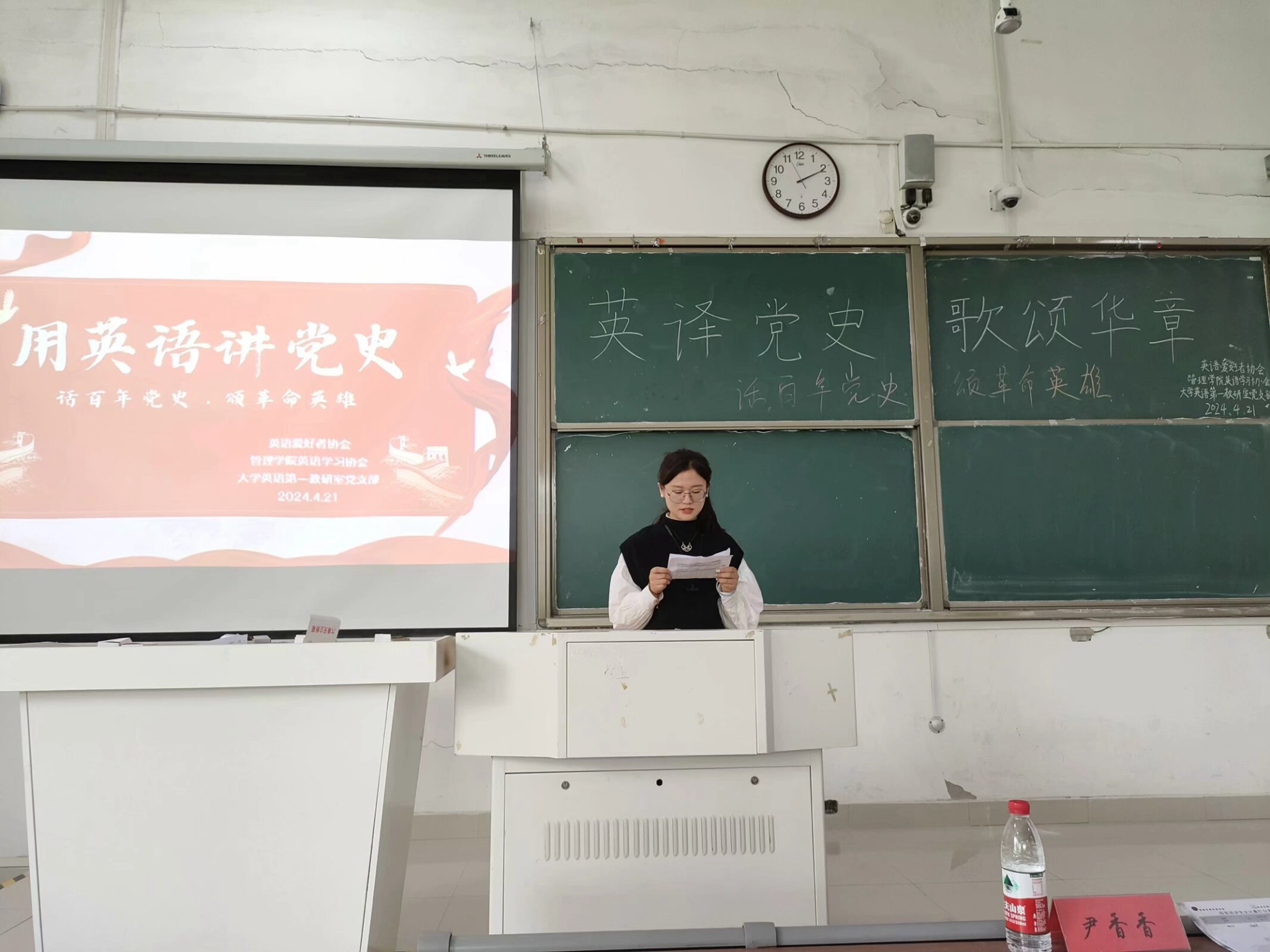 为传承弘扬红色文化,厚植爱党爱国情感,提高学生英语综合应用能力,4月21日,管理学院英语学习协会联合校英语爱好者协会在致知楼C111成功举办“英译党史 歌颂华章”英语演讲比赛。外国语学院黄金金老师到场指导,龙湖校区各学院英语爱好者现场观摩比赛。