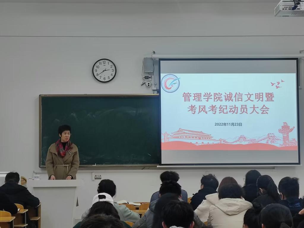 为营造诚信文明、承诺守信及风清气正的考风考纪浓厚氛围。11月23日下午,管理学院在龙湖校区致知楼B103教室召开诚信文明主题教育暨考风考纪动员大会,院党委副书记陶漫、党政办公室主任李永鹏、团委副书记江旭聪、22级新生辅导员赵晨妍出席会议。会议由江旭聪主持。