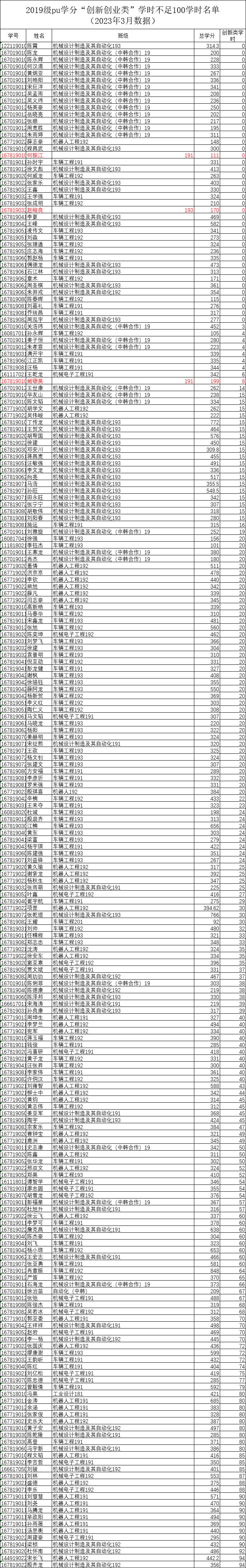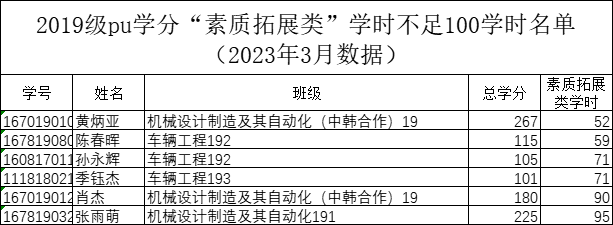机械工程学院2022-2023-2学期二课堂学分(PU)未达标名单公示(2023届)