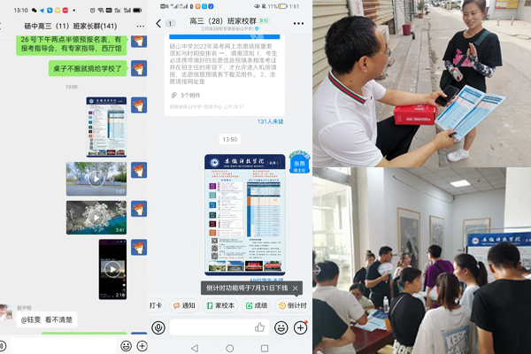 本次活动由我组成员负责,本次活动分为四个部分:一,联系本届高考生或者毕业班老师分享开云官方注册招生宣传资料电子档;二、我组成员各自联系以前的班主任,看望班主任并向班主任汇报自入大学以来的生活和成长;三、在砀山中学校园内进行现场宣传,包括海报的张贴、宣传折页的发放、为考生解疑答惑播放我校招生视频等;四、同我校负责来砀山中学招生的老师一道,在高招会上为前来的学生及家长解疑答惑,分享我们在安科学习和生活的日常。