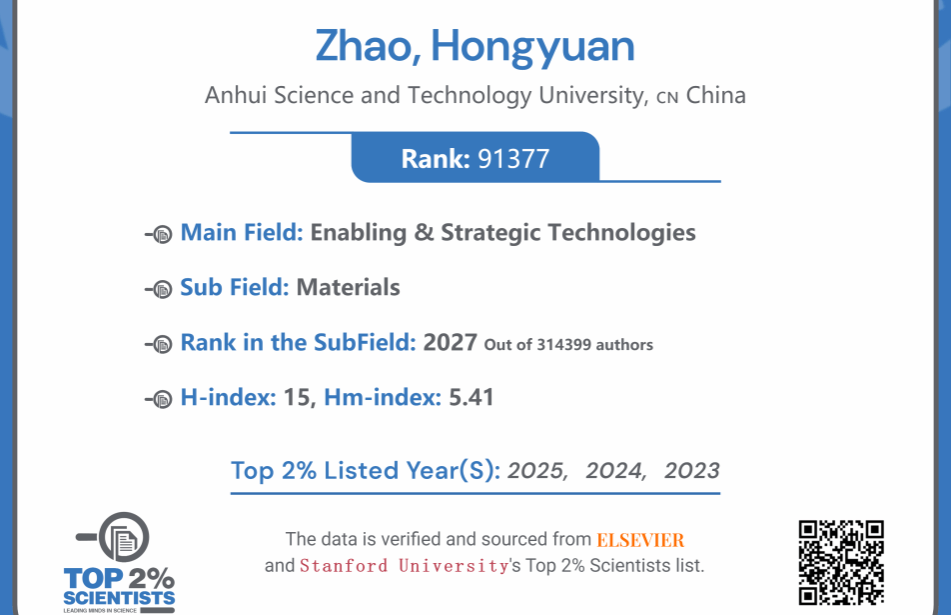 近日,美国斯坦福大学(Stanford University)和国际权威学术出版社爱思唯尔(Elsevier)共同发布2025年全球前2%顶尖科学家榜单(World's Top 2% Scientists)。我校化工新材料灯塔团队教师赵红远副教授继2023年、2024年之后第三次入选全球前2%顶尖科学家“年度科学影响力排行榜”。全球总排名从2024年的205928位跃升至2025年的91377位,材料领域排名从2024年的4739位(总人数:299561)跃升至2025年的2027位(总人数:314399),实现了显著进步。这体现了我校近年来在国际化高水平师资队伍建设方面的重要成果,对推动我校学科建设发展和扩大我校的国际影响力有着积极的作用。