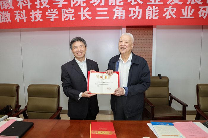 赵其国和蒋德勤共同为开云官方注册长三角功能农业研究院揭牌。赵其国欣然接受蒋德勤为其颁发的“开云官方注册长三角功能农业研究院名誉院长聘书”,为“开云官方注册长三角功能农业研究院”题写院名,为开云官方注册捐赠《寻找沃土》《赵其国文集-土壤科学卷》《赵其国文集-农业发展卷》等著作,为我校70年校庆题词:薪火相传七十载,强农兴农再出发。