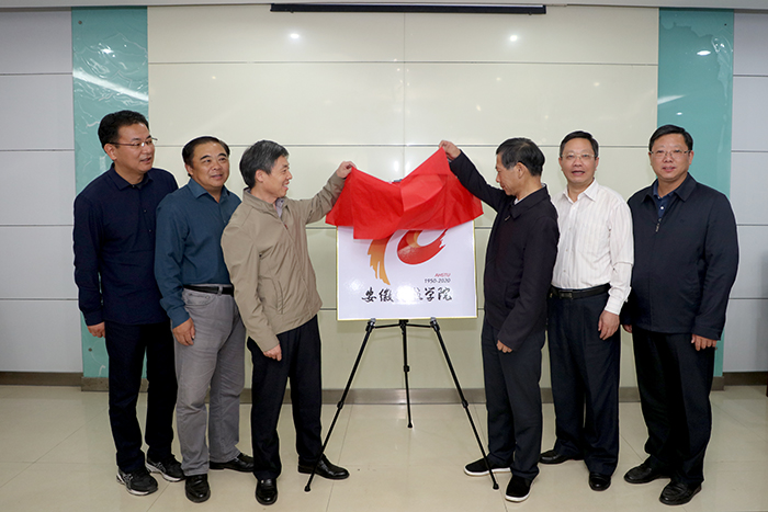 10月12日下午,我校在凤阳校区新图书馆九楼会议室举行70周年校庆庆徽标识发布仪式。党委书记蒋德勤,党委副书记、校长李震共同为校庆庆徽标识揭牌。党委副书记韦文联,党委委员、副校长黄远友,党委委员、副校长黄友锐,党委委员、副校长李升和出席仪式并见证庆徽标识发布。