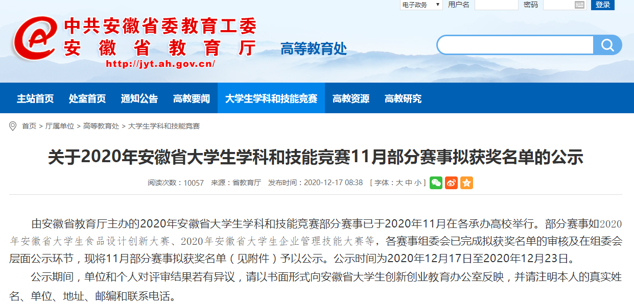 2019年 “凤宝杯”安徽省大学生食品设计创新大赛,学院有十件参赛作品被推选参加“凤宝杯”安徽省大学生食品设计创新大赛,获一等奖4件、二等奖3件、三等奖1件。2020年 “三只松鼠杯”安徽省食品设计创新大赛,学院参赛作品共获一等奖2项,二等奖1项,三等奖6项,优秀奖1项。