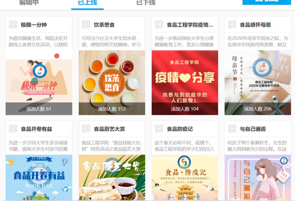 打造两个校园文化品牌。食品安全宣传月和食品文化节是食品工程学院多年来用心打造的两个具有明显专业特色的学院文化品牌,近年又多次被学校评选为校园文化品牌。在新冠疫情肆虐的背景下,2020年的食品安全宣传月活动,同学们窝居在家无法开展线下相关活动,活动组织者因势利导,在活动内容和形式上进行了探索,聚焦后疫情时代食品安全与健康,创新性云上一体化推进食品安全宣传月系列主题活动,线下改线上,通过线上云交流、线上云展示、线上投票、线上知识竞赛,在展示创作作品的同时,宣传食品安全知识,号召呼吁广大学子关注食品安全,强化食品安全知识学习,提高健康安全意识。
