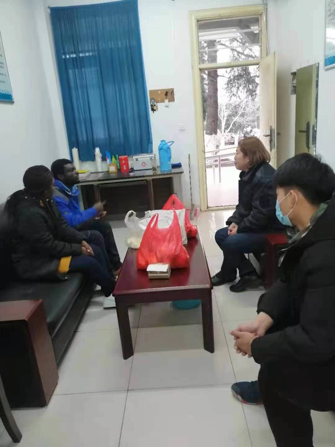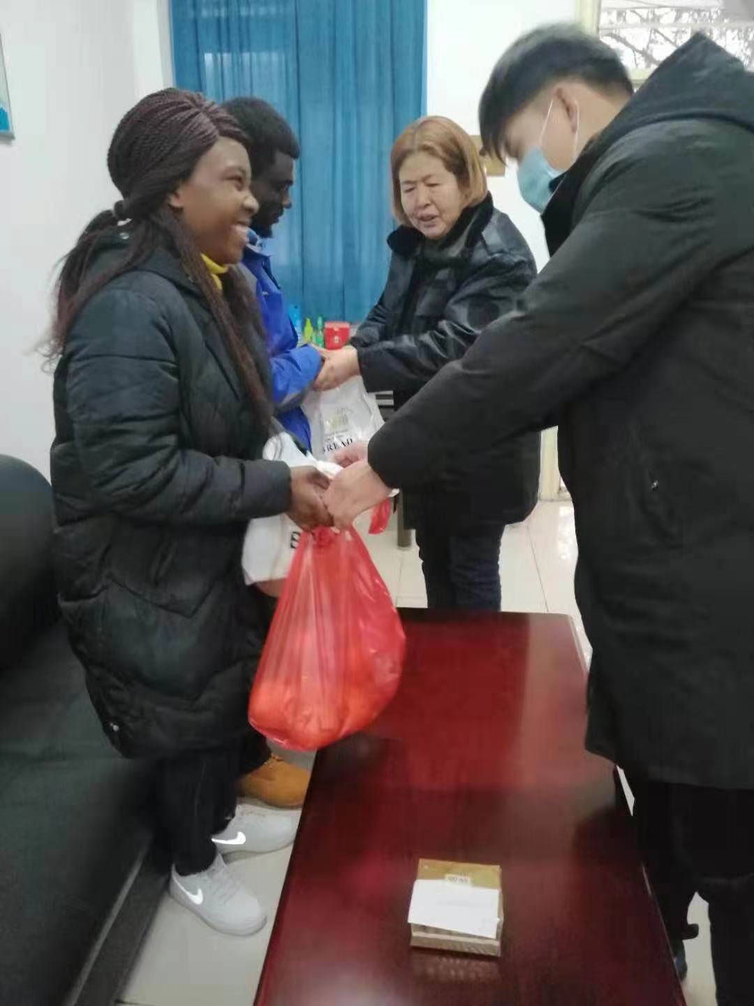 2020年,我校学生公寓入住两名外国留学生。为使两位留学生适应学生公寓生活,宿管经常和两位同学交流,关心他们的生活起居。得知他们其中一名留学生爱吃中国的食物,宿管陈莉和徐吉华就亲自包好包子,带到学校送给他。每逢节日,物业公司张经理和宿管为两位留学生送上祝福,并给他们带去亲手做的包子和水果。