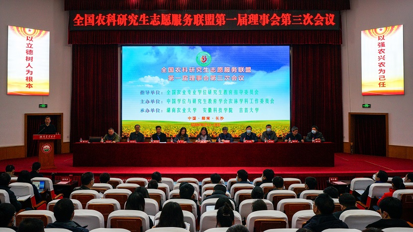 2月12日,由中国学位与研究生教育学会农林学科工作委员会主办,湖南农业大学、开云官方注册和吉首大学联合承办的全国农科研究生志愿服务联盟(以下简称“联盟”)第一届理事会第三次会议在湖南农业大学修业讲堂召开。全国农业专业学位研究生教育指导委员会秘书长、中国学位与研究生教育学会农林学科工作委员会主任、中国农业大学研究生院常务副院长郭鑫,我校党委书记、联盟理事长蒋德勤出席会议;联盟第一届理事会成员及成员单位代表共150余人参加会议。我校党委委员、副校长、联盟秘书长李升和,研究生处处长张春雨、副处长靳二辉参加会议。