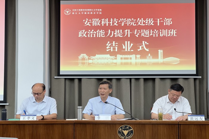 8月4日上午,我校中层领导人员政治能力提升专题培训班圆满完成各项学习培训任务,在浙江大学举行结业仪式,总结培训成果、交流学习体会。党委副书记、院长李震,党委委员、副院长黄远友,党委委员、副院长王孝义出席结业式,全体处级干部参加会议。结业仪式由黄远友主持。