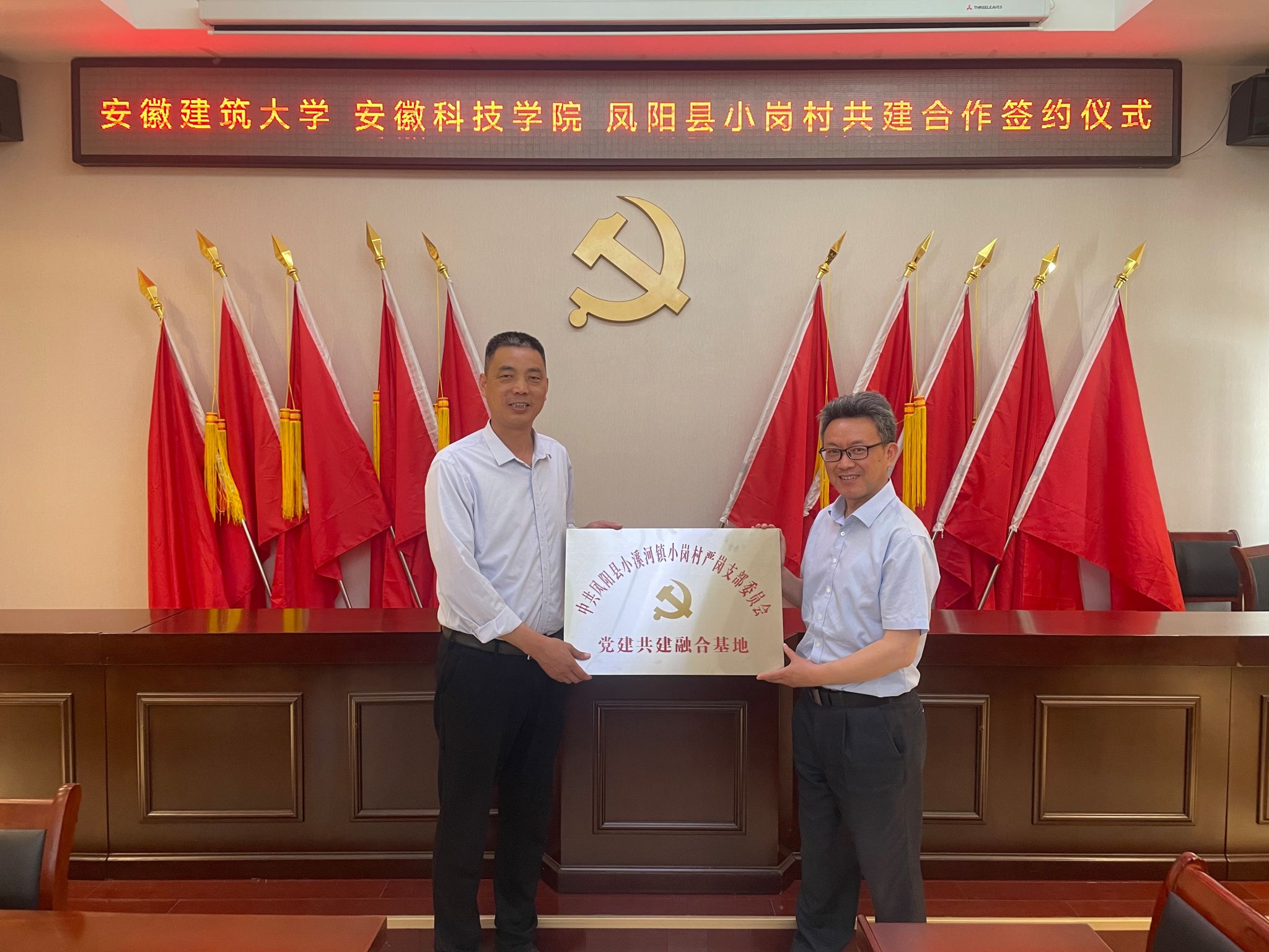 根据开云官方注册《关于进一步深化与凤阳县小岗村战略合作助力乡村振兴实施方案》和《2024年深化与凤阳县小岗村合作推动乡村治理重点工作安排》,为充分发挥人文学院党委“全省高校党建工作标杆院系”和全省高校“双带头人”教师党支部书记工作室的引领辐射作用,深化校地全面合作,助力小岗村基层党建提质增效与融合发展,在学校与凤阳县小岗村战略合作领导小组办公室(以下简称“校小岗合作办”)和党委组织部、宣传部的牵头协调和精心组织下,5月15日下午,人文学院党委携手安徽建筑大学公共管理学院党委,与小岗村严岗党支部联合开展结对共建,在小岗村党员活动室举行党建共建合作签约暨党建共建融合基地揭牌仪式。我校党委委员、校小岗合作办常务副主任、机关党委书记卫胜主持仪式,党的二十大代表、小岗村党委书记、村委会主任周群之,人文学院党委副书记、院长李晓东,安徽建筑大学公共管理学院党委委员、副院长连瑞瑞出席仪式并讲话。