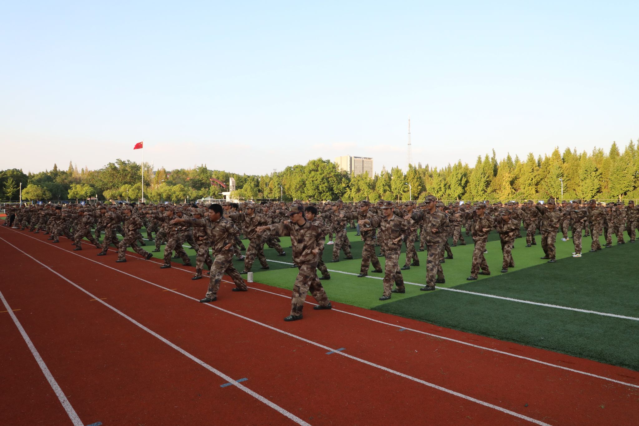 在军训成果展示中,全体军训新生身着戎装,满腔热血,军姿飒爽,气宇轩昂。在护旗方队的引领下,各连徒步方阵步履铿锵地依次通过观礼台。随后,坦克旗语、格斗术、棍术表演、捕俘拳、摆字方阵等依次展示。摆字方阵先后拼出“请党放心 强国有我”等字型,充分展示了安科学子矢志报国、挺膺担当的家国情怀,军训汇演现场高潮迭起,掌声雷动,现场师生连连喝彩。