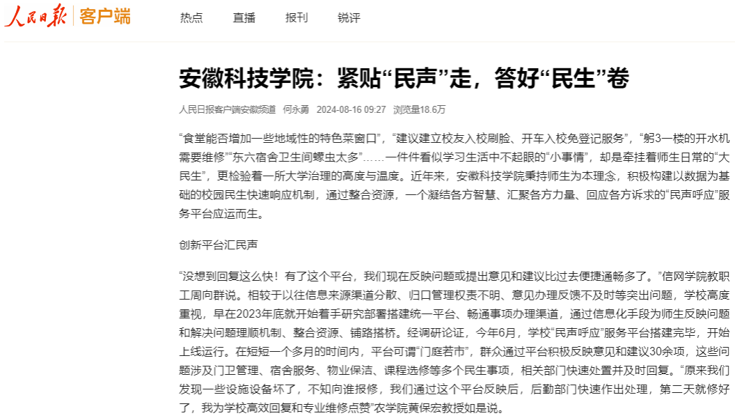 2024年6月,在整合我校现有各类信访渠道基础上,党委(校长、法治)办公室牵头创建的民声呼应服务平台正式上线运行。作为全省高校系统较早创建的民声呼应平台,按照“民有所呼、我有所应”的服务理念,集成现有信访渠道资源,将各类信访事项分成建议类、咨询类和投诉类等三个大类,并根据问题性质和紧要程度选择不同的批转办理方式,实现了信访事项“分类管理、迅速处置,全程督办、跟踪评价”的闭环管理,显著提高了审批效率和回应速度。同时,在尊重信访人意愿基础上,相关共性问题实现信息公开,从点上发现问题,在面上寻找答案,努力实现“回应一个诉求,解决一类问题,提升一个领域”的工作效果。平台运行以来,群众通过平台积极反映意见和建议72项,回复率达100%,群众满意度超80%。《人民日报》客户端专题报道我校民声呼应平台相关做法,相关做法受到安徽省教育厅专门发文通报表扬。