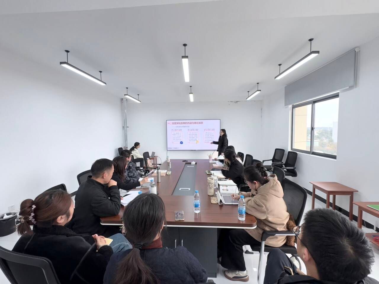 本次活动以“深化改革破浪行,开放引领新征程”为主题,聚焦《习近平谈治国理政》第五卷中关于改革开放的重要论述,开展专题汇报与心得研讨。活动伊始,主持人简要介绍了本次学习的篇目内容与核心环节。随后,徐萌、操珍珍、周箐、王晋超四位同学依次从理论逻辑、历史逻辑、现实逻辑与前沿问题等不同维度,对改革开放这一主题进行了系统阐述与深入解读。