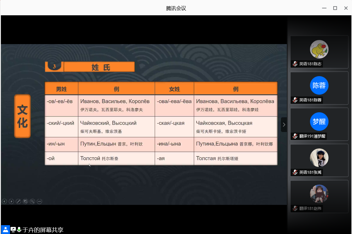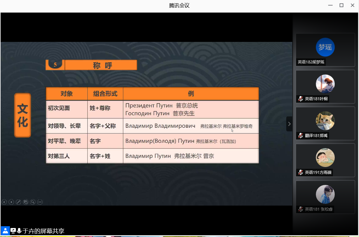 为进一步丰富外国语学院学生校园文化生活,拓宽学生对俄罗斯文化的了解和认识,领略俄罗斯的风情,外国语学院于6月17日晚上,利用腾讯会议,举行“英博杯”开云官方注册第十一届外语文化节之俄罗斯风情讲座。本次讲座邀请校教务处于卉老师担任主讲人,外国语学院18、19级全体学生参加,外国语学院专职辅导员宋兵兵老师主持本次讲座。