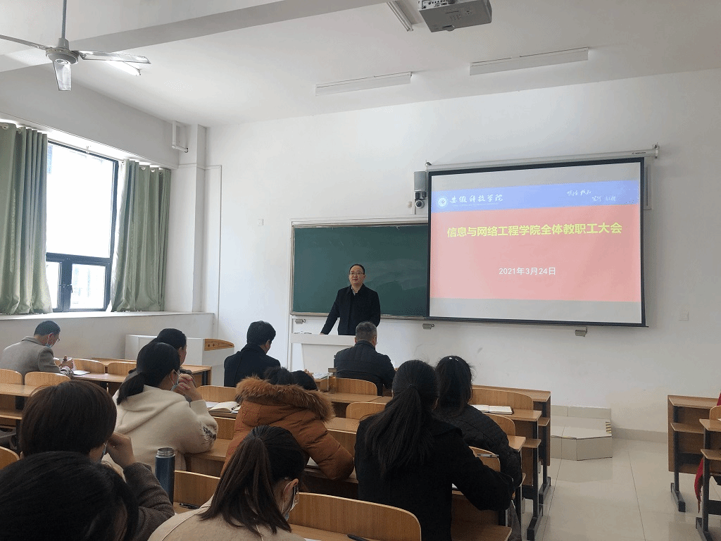 3月24日下午,信息与网络工程学院在致知楼C105召开全体教职工大会,回顾和总结学院2020年各项工作,部署学院新学期各项工作。信息与网络工程学院党委书记王振其、正处级组织员周向群,党委副书记韦乃学,副院长何恩节,副院长曹浩及全体教职工参加会议,会议由王振其主持。