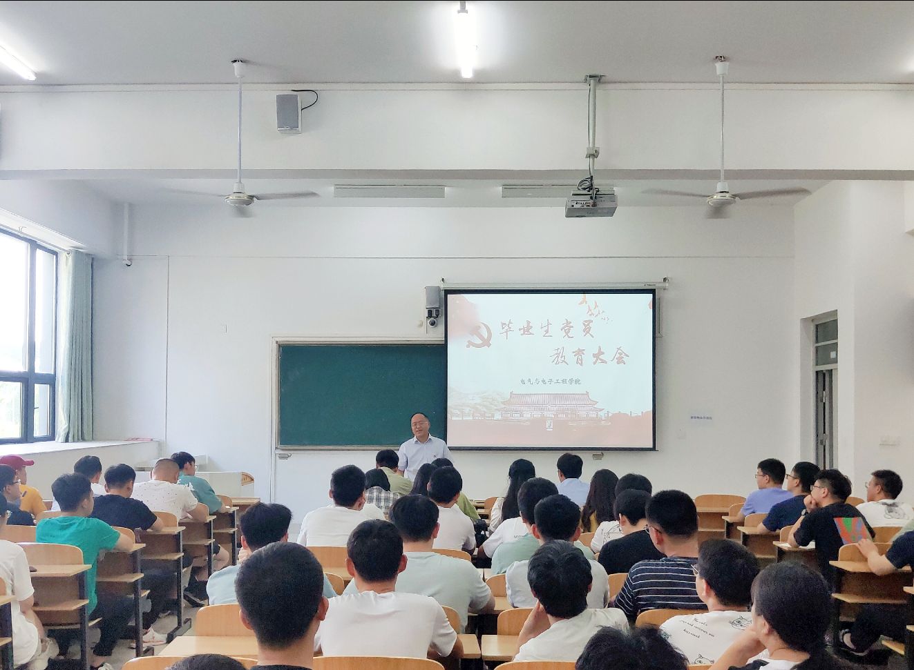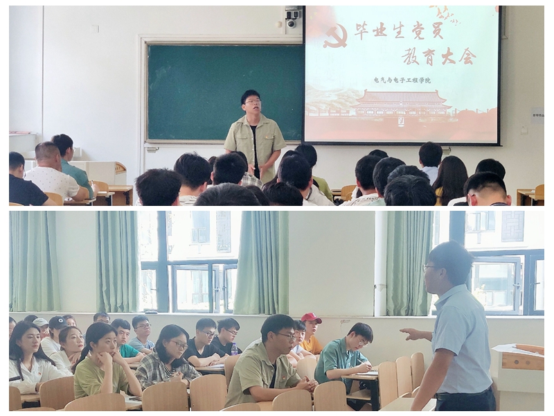 为加强党员管理,强化党员身份意识,切实发挥党员模范带头作用,电气与电子工程学院于5月31日下午在致知楼C栋107召开全体毕业生党员教育大会。学院党委副书记尚磊、电气电信专业学生党支部书记洪乃羽、光电建电专业学生党支部书记张深及全体毕业生党员出席会议。
