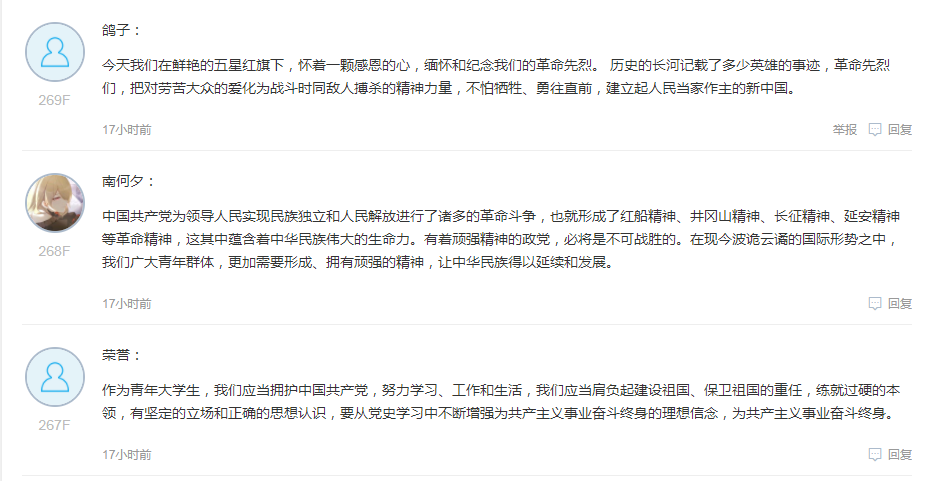 活动内容包括由安徽省智慧思政课教学平台举办全省师生"同上一堂'党史'大课"活动和由共青团安徽省委、安徽省学生联合会主办的“百年风华正青春”主题青春思政课。通过学习线上思政课,大家更加深刻的认识到中国共产党的精神谱系,特别是大别山精神、新四军精神、渡江精神、小岗精神这些发生在安徽省内的感人肺腑、激励人心的革命精神。同时也懂得了“明理、增信、崇德、力行”对于当代青年发展的重要性。在学习之后,学院通过易班平台发布了“同上思政大课 同悟红色精神”的线上学习交流活动,同学们畅谈学习感受,累计浏览量1083次,学生发表个人学习感受近三百条,真正落实“学有所悟,学有所获”。