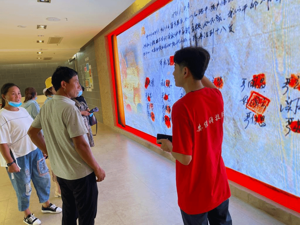 在参观中,三名同学深刻感受到“穷则变,变则通,通则久”的小岗村精神,小岗精神是中华民族优秀传统文化求变图强基因的传承,也是中国共产党的先进文化“解放思想、实事求是,团结一致向前看”的探索成果。在小岗村党委办公室,三名同学详细了解了小岗人民外出务工、近年生活变化、政策支持等各方面的情况,并深入居民社区、田间地头,实地探访小岗村改革发展的取得的成就。在大包干纪念馆内,三名同学义务为前来参观的游客进行宣讲,通过讲述小岗探索家庭联产承包责任制的经过和十八枚红手印的故事,深刻的阐述了“敢闯、敢试、敢为天下先”的大包干精神,赢得现场游客连连称赞。