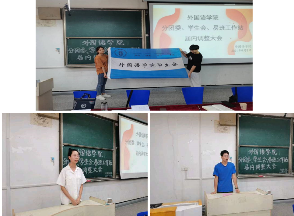 2021年9月8日下午,外国语学院在求A106教室举行2020-2021学年学生骨干培训班结业典礼暨学院分团委、学生会、易班工作站届内调整大会。学院党委副书记张海亮、党政办主任陈慧中、团委副书记宋兵兵、辅导员张薇薇出席会议,会议由宋兵兵主持。