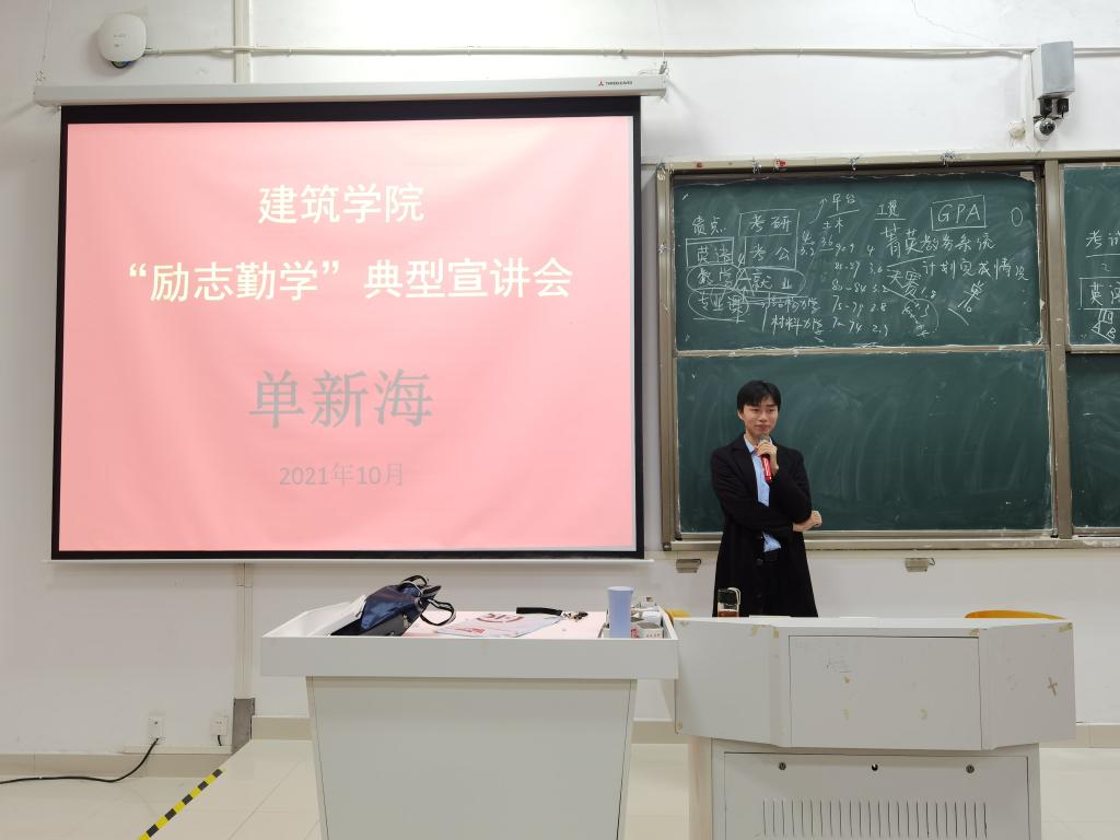 继往开来 薪火相传。10月21日晚,建筑学院在致知楼C111举行了“励志勤学”典型宣讲会。本次宣讲会特邀省优秀共青团员、 “大学生年度提名”称号获得者、18级土木工程专业单新海主讲,21级全体新生参加,辅导员武辉老师主持。
