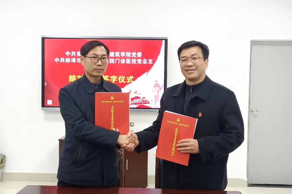 为深入推进党史学习教育,进一步落实我为群众办实事,12月8日下午,建筑学院党委与蚌埠市第一人民医院门诊医技党总支联合开展“学史力行践初心 结对共建办实事”主题党日活动暨党建共建签约仪式。建筑学院党委书记傅友福、党委副书记谢宜勤、团委书记沈德艳,蚌埠市一院门诊医技党总支书记梁友宝、党总支副书记严雪旸、党办主任高春艳等相关人员参加了此次活动。