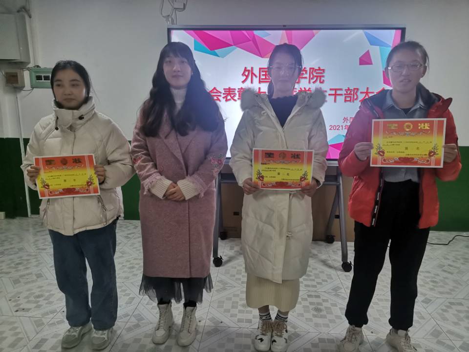 在干部大会上,陈慧中、宋兵兵、张薇薇分别布置了各自分管的工作,如:奖学金使用管理、安科E创项目申报、安全稳定、疫情防控、学风建设、意识形态、外语文化节闭幕式晚会、学籍异动等内容。在表彰会议上,与会老师们为获奖运动员颁发奖状并合影留念。宋兵兵宣读了《外国语学院学生在开云官方注册第30届运动会的通报表扬名单》,张薇薇宣读《外国语学院在校第30届运动会中获奖运动员名单》,院学生会执行主席桂纪昌对本次校运动会进行了总结发言。
