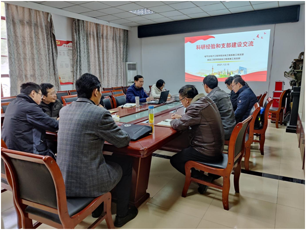 12月15日上午,电气与电子工程学院光电工程系教工党支部与食品工程学院食品工程系教工党支部在食品工程学院会议室开展了一场以“科研经验和支部建设”为主题的交流活动。电气与电子工程学院光电工程系教工党支部的5名党员代表和食品工程学院食品工程系教工党支部、食品安全系教工党支部及研究生支部的6名党员代表参加了本次交流。