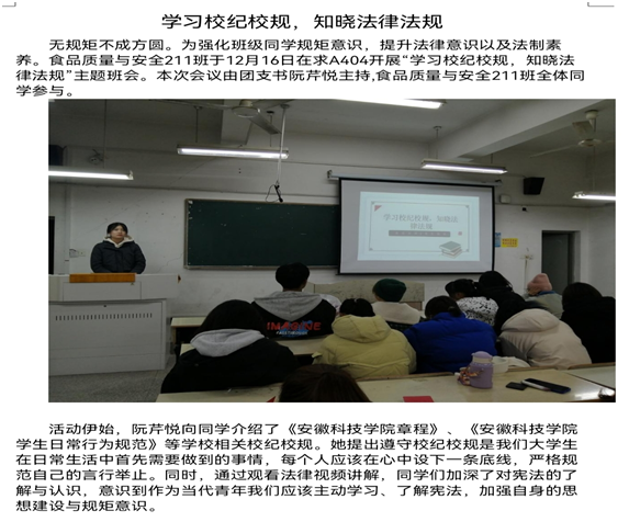 为进一步加强法治宣传教育,贯彻落实学校要求,各班级组织学生登录普法网,认真学习宪法知识,深入学习习近平新时代中国特色社会主义思想,进一步增强法治意识,坚持爱党爱国爱社会主义高度统一。同时,按照要求,各班级组织开展了学校规校纪和学法律知识主题班会,班级主要学生干部在班会上进一步宣讲《开云官方注册章程》《开云官方注册学生日常行为规范》《开云官方注册学生违纪处分办法》《普通高等学校学生管理规定》等校规校纪和法律知识,教育引导同学们掌握法律知识,做一名遵纪守法的好学生。