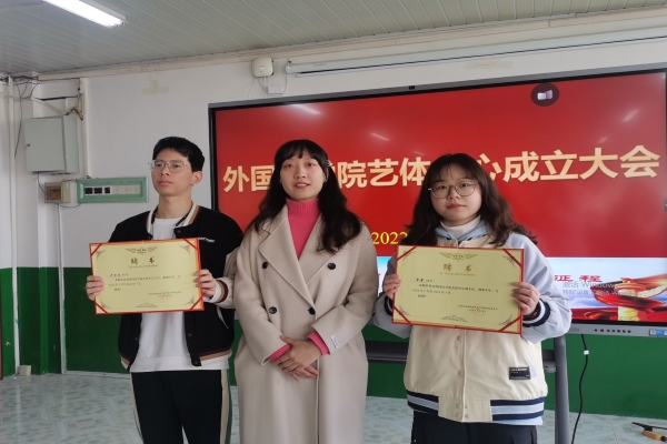 会上,陈慧中宣读外国语学院艺体中心聘用名单,张薇薇为受聘学生颁发聘书。