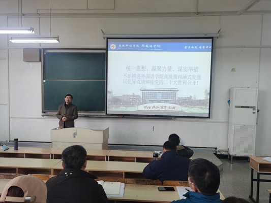 3月23日下午,外国语学院在求知楼A202教室举行全体教职工大会,部署新冠肺炎疫情防控工作、推进学院年度重点工作。学院领导班子及全体教职工参加会议,会议采用线下和线上同步模式,因居家隔离等原因无法到场的教职工在线上参加会议。会议由学院院长陈德用主持。