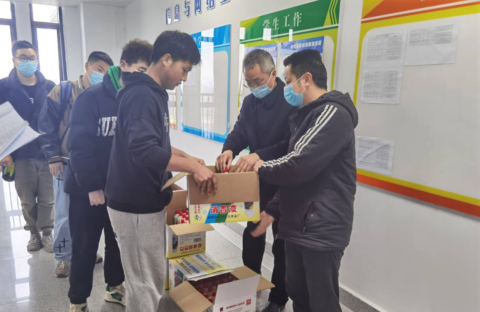 王振其、余宏杰在疫情防控消杀物品发放现场,给每一间宿舍的学生代表发放84消毒液消杀物品,并叮嘱学生们要充分认清当前疫情防控的艰巨性、复杂性、反复性,摒弃一切侥幸的心理、麻痹大意的思想,增强对疫情防控的敏感性,要做好每日宿舍卫生消杀工作、严格执行“日报告” “零报告”制度、晨午晚体温检制度,提高自我防护意识和能力,积极广泛地宣传疫情防控知识,努力形成全体师生思想同心、行动同步、共同抗疫的良好局面,守住美丽校园疫情“零输入”底线。