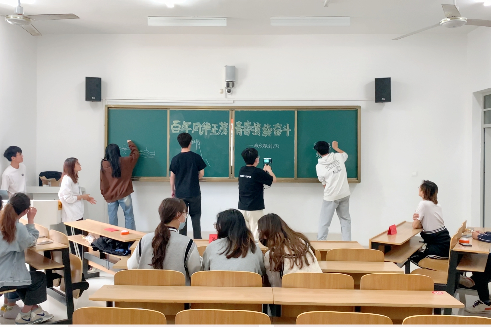 “绘图接龙”环节,同学们以自主、探索、合作为主的方式参与其中。他们齐心协力,结合专业特长,挥动手中的粉笔或画笔,将自己对于团史红色故事的理解呈现在黑板、画纸上。在作图方面,或以故事思维导图形式,或以红色记忆标语形式,重温经典。
